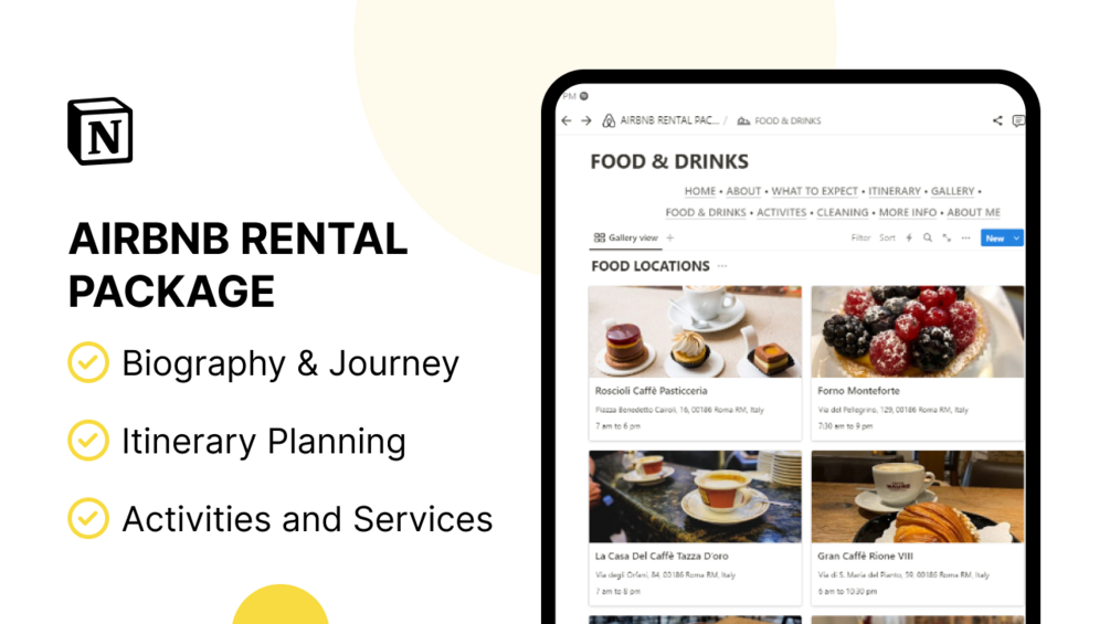 The itinerary section simplifies planning for your guests, enabling them to organize their stay with ease. Whether it's scheduling activities, noting food and drinks options, or coordinating cleaning services, our template ensures a seamless guest experience.